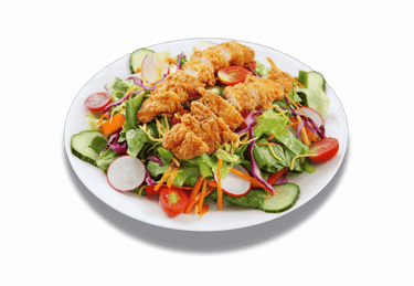 Salade, tomate, oignon, maïs, champignons, olives noires, œuf, jambon blanc ou poulet